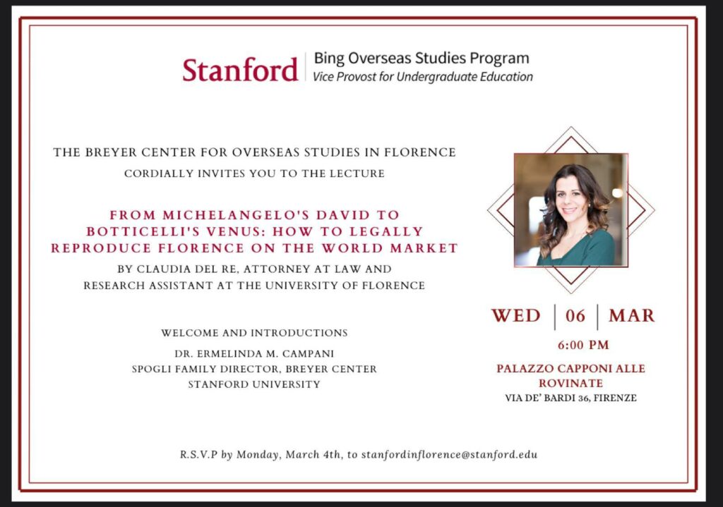06/03/2024: L’Avv. Claudia Del Re terrà una conferenza su “From Michelangelo’s David To Botticelli ‘s Venue: How To Legally Reproduce Florence On The World Market” presso Stanford University in Florence