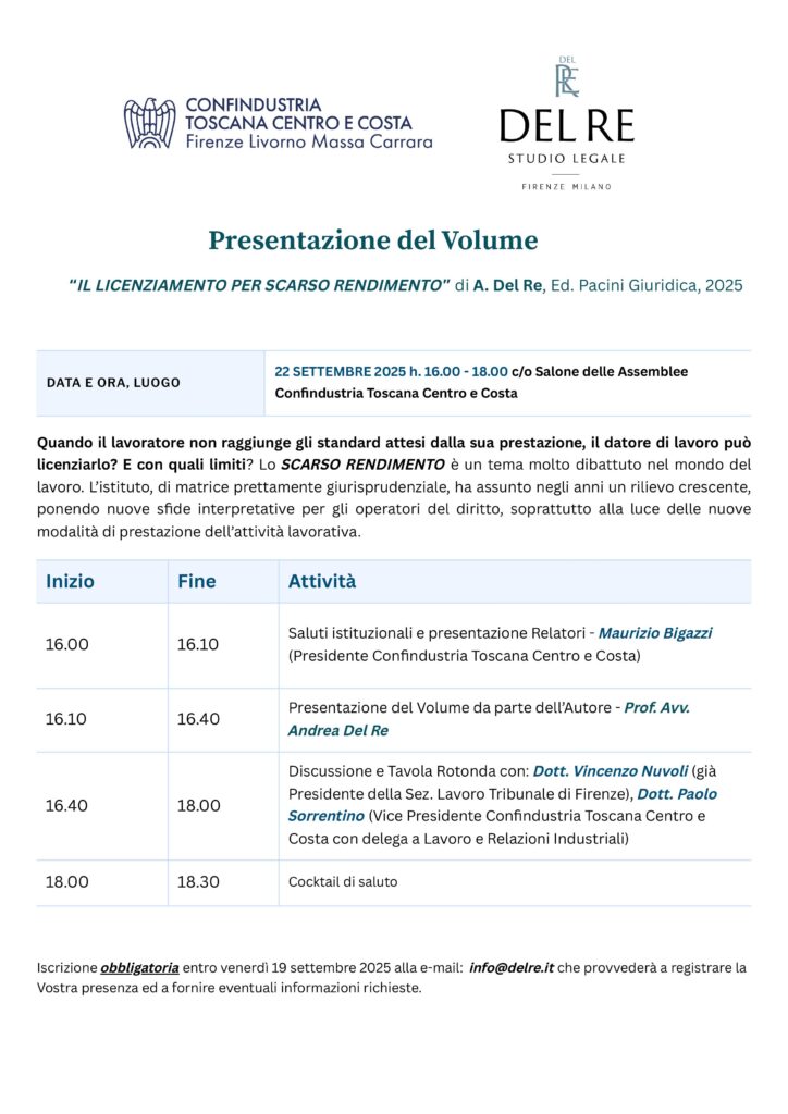 Presentazione Volume Avv. Andrea Del Re “Il licenziamento per scarso rendimento”