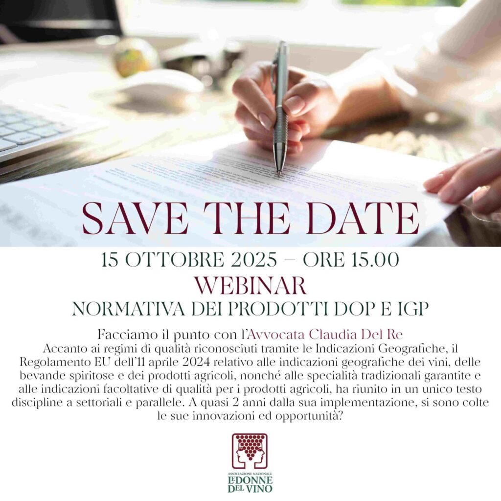 15/10/2025- L’Avv. Claudia Del Re interverrà su “Normativa dei prodotti DOP e IGP” al Webinar organizzato dall’Associazione Le Donne del Vino e dallo Studio Legale Del Re
